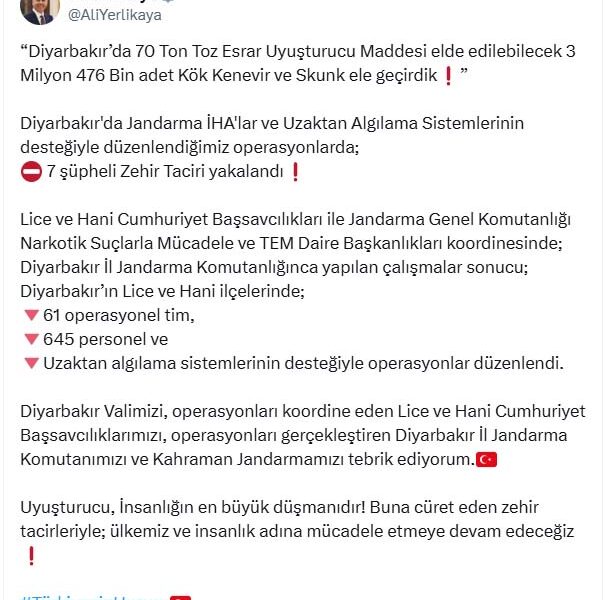 İçişleri Bakanı Ali Yerlikaya, Diyarbakırın Lice ve Hani ilçelerinde jandarma tarafından düzenlenen narkotik operasyonunu sosyal medya hesabından paylaştı. Buna göre; 61 operasyonel tim ve 645 personelin katılımıyla düzenlenen, uzaktan algılama sistemlerinin kullanıldığı operasyonda, 70 ton toz esrar elde edilebilecek 3 milyon 476 bin kök kenevir ve skunk ele geçirildi, 7 şüpheli gözaltına alındı.