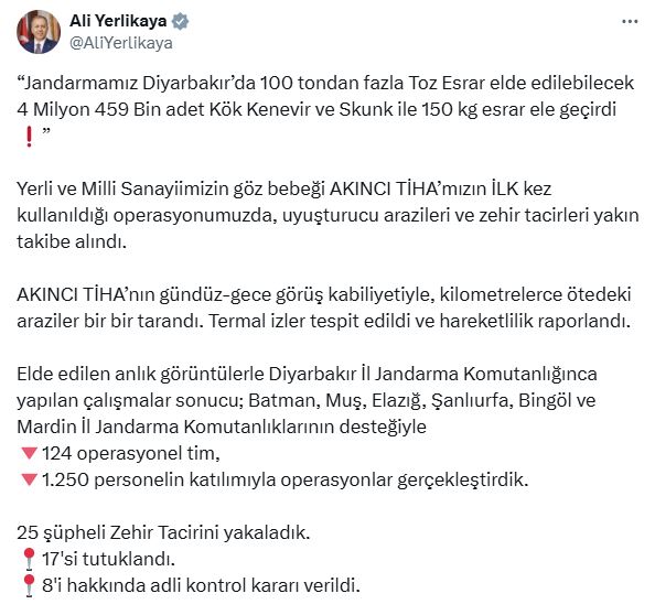 İçişleri Bakanı Ali Yerlikaya, Diyarbakır’da jandarma tarafından düzenlenen narkotik operasyonunu sosyal medya hesabından paylaştı. Buna göre; yerli taarruzi insansız hava aracı AKINCInın ilk kez kullanıldığı operasyonda, uyuşturucu ekili araziler ve uyuşturucu tacirleri yakın takibe alındı. AKINCI TİHAnın gündüz-gece görüş kabiliyetiyle, kilometrelerce mesafedeki araziler tarandı. Termal izler tespit edildi ve hareketlilik raporlandı. Elde edilen anlık görüntülerle Diyarbakır İl Jandarma Komutanlığı tarafından yapılan çalışmalar sonucu; Batman, Muş, Elazığ, Şanlıurfa, Bingöl ve Mardin İl Jandarma Komutanlıklarının desteğiyle 124 operasyonel tim, 1250 personelin katılımıyla operasyon gerçekleştirildi. Operasyonda 25 şüpheli yakalandı, 100 tondan fazla toz esrar elde edilebilecek, 4 milyon 459 bin kök kenevir ve skunk ile 150 kilogram esrar ele geçirildi. Şüphelilerden 17si çıkarıldıkları hakimliklerce tutuklandı, 8i hakkında adli kontrol kararı verildi.