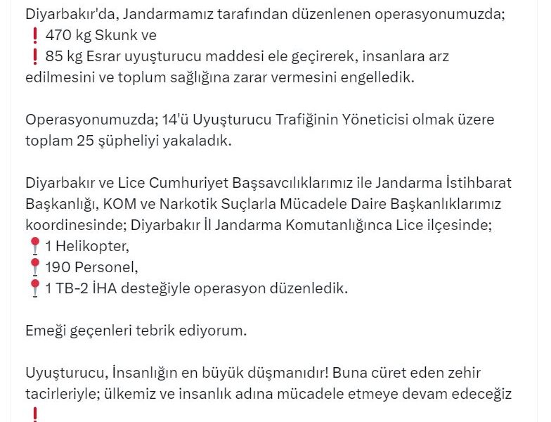 Bakan Yerlikayanın sosyal medya hesabından yaptığı açıklamaya göre; Diyarbakır ve Lice Cumhuriyet Başsavcılıkları ile Jandarma İstihbarat Başkanlığı, Kaçakçılık ve Organize Suçlarla Mücadele Başkanlığı ve Narkotik Suçlarla Mücadele Daire Başkanlığı koordinesinde; Diyarbakırda jandarma tarafından düzenlenen operasyonlarda; 470 kilogram skunk ve 85 kilogram esrar uyuşturucu maddesi ele geçirildi. 1 helikopter, 190 personel ve 1 TB-2 İHA desteğiyle düzenlenen operasyonlarda; 14ü uyuşturucu trafiğinin yöneticisi olmak üzere toplam 25 şüpheli yakalandı. Bakan Yerlikaya, “Ele geçirilen uyuşturucunun insanlara arz edilmesini ve toplum sağlığına zarar vermesini engelledik. Emeği geçenleri tebrik ediyorum. Uyuşturucu, insanlığın en büyük düşmanıdır. Buna cüret eden zehir tacirleriyle; ülkemiz ve insanlık adına mücadele etmeye devam edeceğiz” dedi.