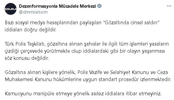 DMMnin sosyal medya hesabından yapılan açıklamada, “Bazı sosyal medya hesaplarından paylaşılan Gözaltında cinsel saldırı iddiaları doğru değildir. Türk Polis Teşkilatı, gözaltına alınan şahıslar ile ilgili tüm işlemleri yasaların çizdiği çerçevede yürütmekte olup, iddialardaki gibi bir olayın yaşanması söz konusu değildir. Gözaltına alınan kişilere yönelik, Polis Vazife ve Selahiyet Kanunu ve Ceza Muhakemesi Kanunu hükümlerine uygun standart prosedür izlenmektedir. Kamuoyunu manipüle etmeye yönelik asılsız iddialara itibar etmeyiniz” denildi.