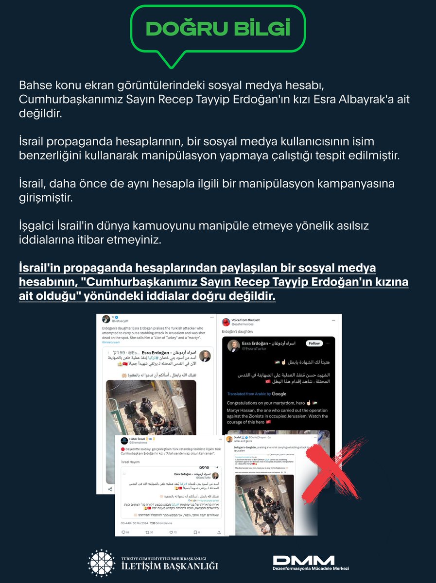 DMM, sosyal medya hesabından yapılan paylaşımda, “İsrailin propaganda hesaplarından paylaşılan bir sosyal medya hesabının, Cumhurbaşkanı Recep Tayyip Erdoğanın kızına ait olduğu yönündeki iddialar doğru değildir. Bahse konu ekran görüntülerindeki sosyal medya hesabı, Cumhurbaşkanı Recep Tayyip Erdoğanın kızı Esra Albayraka ait değildir. İsrail propaganda hesaplarının, bir sosyal medya kullanıcısının isim benzerliğini kullanarak manipülasyon yapmaya çalıştığı tespit edilmiştir. İsrail, daha önce de aynı hesapla ilgili bir manipülasyon kampanyasına girişmiştir. İşgalci İsrailin dünya kamuoyunu manipüle etmeye yönelik asılsız iddialarına itibar etmeyiniz” ifadelerine yer verildi.