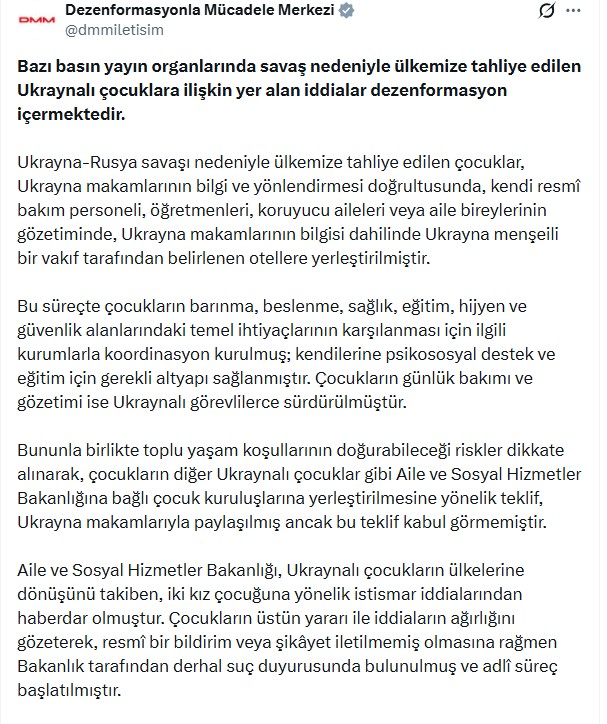 DMMnin sosyal medya hesabından yapılan açıklamada, “Bazı basın yayın organlarında savaş nedeniyle ülkemize tahliye edilen Ukraynalı çocuklara ilişkin yer alan iddialar dezenformasyon içermektedir. Ukrayna-Rusya savaşı nedeniyle ülkemize tahliye edilen çocuklar, Ukrayna makamlarının bilgi ve yönlendirmesi doğrultusunda, kendi resmi bakım personeli, öğretmenleri, koruyucu aileleri veya aile bireylerinin gözetiminde, Ukrayna makamlarının bilgisi dahilinde Ukrayna menşeili bir vakıf tarafından belirlenen otellere yerleştirilmiştir. Bu süreçte çocukların barınma, beslenme, sağlık, eğitim, hijyen ve güvenlik alanlarındaki temel ihtiyaçlarının karşılanması için ilgili kurumlarla koordinasyon kurulmuş; kendilerine psikososyal destek ve eğitim için gerekli altyapı sağlanmıştır. Çocukların günlük bakımı ve gözetimi ise Ukraynalı görevlilerce sürdürülmüştür” denildi.