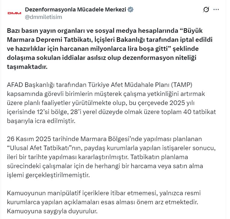 DMMnin sosyal medya hesabından yapılan açıklamada, bazı basın yayın organları ve sosyal medya hesaplarında Büyük Marmara Depremi Tatbikatı, İçişleri Bakanlığı tarafından iptal edildi ve hazırlıklar için harcanan milyonlarca lira boşa gitti şeklinde iddiaların dolaşıma sokulduğu belirtilerek, “İddialar asılsız olup dezenformasyon niteliği taşımaktadır. AFAD Başkanlığı tarafından Türkiye Afet Müdahale Planı (TAMP) kapsamında görevli birimlerin müşterek çalışma yetkinliğini artırmak üzere planlı faaliyetler yürütülmekte olup, bu çerçevede 2025 yılı içerisinde 12’si bölge, 28’i yerel düzeyde olmak üzere toplam 40 tatbikat başarıyla icra edilmiştir. 26 Kasım 2025 tarihinde Marmara Bölgesi’nde yapılması planlanan Ulusal Afet Tatbikatının, paydaş kurumlarla yapılan istişareler sonucu, ileri bir tarihte yapılması kararlaştırılmıştır. Tatbikatın planlama sürecindeki çalışmalar için de herhangi bir harcama veya satın alma işlemi gerçekleştirilmemiştir. Kamuoyunun manipülatif içeriklere itibar etmemesi, yalnızca resmi kurumlarca yapılan açıklamaları esas alması önem arz etmektedir” denildi.