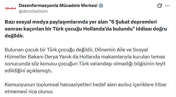 DMMnin sanal medya hesabından yapılan açıklamada, “Bazı sosyal medya paylaşımlarında yer alan 6 Şubat depremleri sonrası kaçırılan bir Türk çocuğu Hollandada bulundu iddiası doğru değildir. Bulunan çocuk bir Türk çocuğu değildir. Dönemin Aile ve Sosyal Hizmetler Bakanı Derya Yanık da Hollanda makamlarıyla kurulan temas sonucunda söz konusu çocuğun Türk vatandaşı olmadığı bilgisinin teyit edildiğini açıklamıştı. Kamuoyunun toplumsal hassasiyetleri hedef alan asılsız içeriklere itibar etmemesi rica olunur” denildi.