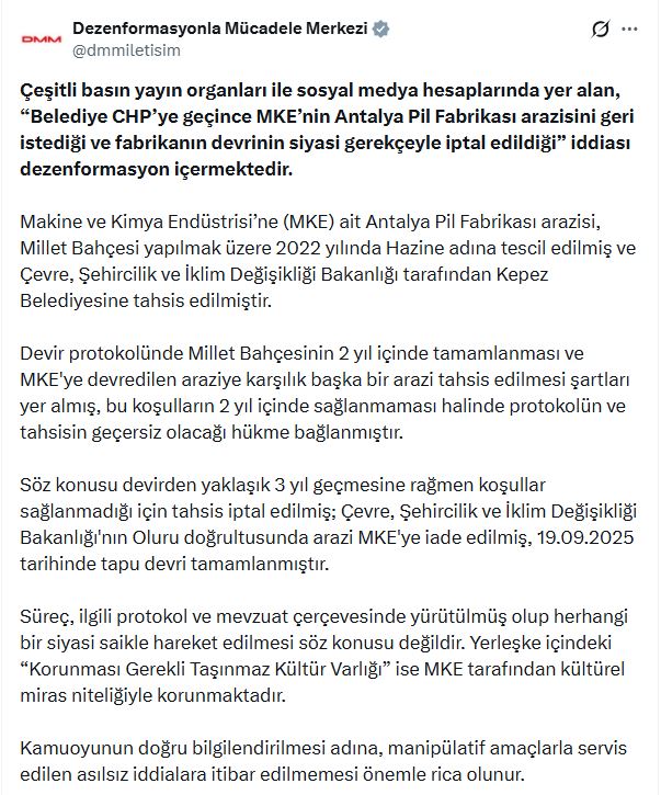 DMMnin sosyal medya hesabından yapılan açıklamada, “Çeşitli basın yayın organları ile sosyal medya hesaplarında yer alan, Belediye CHPye geçince MKEnin Antalya Pil Fabrikası arazisini geri istediği ve fabrikanın devrinin siyasi gerekçeyle iptal edildiği iddiası dezenformasyon içermektedir. Makine ve Kimya Endüstrisine (MKE) ait Antalya Pil Fabrikası arazisi, Millet Bahçesi yapılmak üzere 2022 yılında hazine adına tescil edilmiş ve Çevre, Şehircilik ve İklim Değişikliği Bakanlığı tarafından Kepez Belediyesine tahsis edilmiştir. Devir protokolünde millet bahçesinin 2 yıl içinde tamamlanması ve MKEye devredilen araziye karşılık başka bir arazi tahsis edilmesi şartları yer almış, bu koşulların 2 yıl içinde sağlanmaması halinde protokolün ve tahsisin geçersiz olacağı hükme bağlanmıştır. Söz konusu devirden yaklaşık 3 yıl geçmesine rağmen koşullar sağlanmadığı için tahsis iptal edilmiş, Çevre, Şehircilik ve İklim Değişikliği Bakanlığının oluru doğrultusunda arazi MKEye iade edilmiş, 19 Eylül 2025 tarihinde tapu devri tamamlanmıştır. Süreç, ilgili protokol ve mevzuat çerçevesinde yürütülmüş olup herhangi bir siyasi saikle hareket edilmesi söz konusu değildir. Yerleşke içindeki Korunması Gerekli Taşınmaz Kültür Varlığı ise MKE tarafından kültürel miras niteliğiyle korunmaktadır. Kamuoyunun doğru bilgilendirilmesi adına, manipülatif amaçlarla servis edilen asılsız iddialara itibar edilmemesi önemle rica olunur” ifadelerine yer verildi.