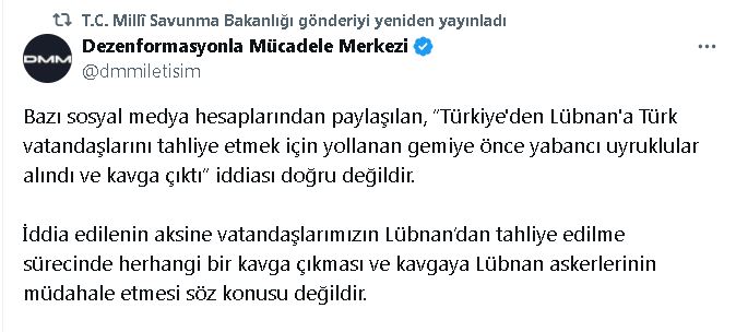 DMMnin sosyal medya hesabından yapılan açıklamada, “Bazı sosyal medya hesaplarından paylaşılan, Türkiyeden Lübnana Türk vatandaşlarını tahliye etmek için yollanan gemiye önce yabancı uyruklular alındı ve kavga çıktı iddiası doğru değildir. İddia edilenin aksine vatandaşlarımızın Lübnandan tahliye edilme sürecinde herhangi bir kavga çıkması ve kavgaya Lübnan askerlerinin müdahale etmesi söz konusu değildir. Lübnanın Beyrut şehrinden Türk vatandaşlarının tahliyesi, ülkemizden Beyruta 300 ton insani yardım malzemesi götüren TCG Sancaktar ve TCG Bayraktar gemileriyle sorunsuz bir şekilde devam etmektedir. Tahliye görevinde öncelikle vatandaşlarımız olmak üzere devletimizden talepte bulunan yabancı ülke vatandaşlarının da Lübnan’dan tahliyesi güvenli şekilde gerçekleştirilmektedir. Dışişleri Bakanlığı, tahliye sürecinde 878 Türk vatandaşı, 24 KKTC vatandaşı ve birinci derece yakınları dahil olmak üzere toplam 966 kişinin Lübnandan tahliye edildiğini ve gemilerin, bu akşam Mersin Limanına varmasının beklendiğini açıklamıştır” denildi.