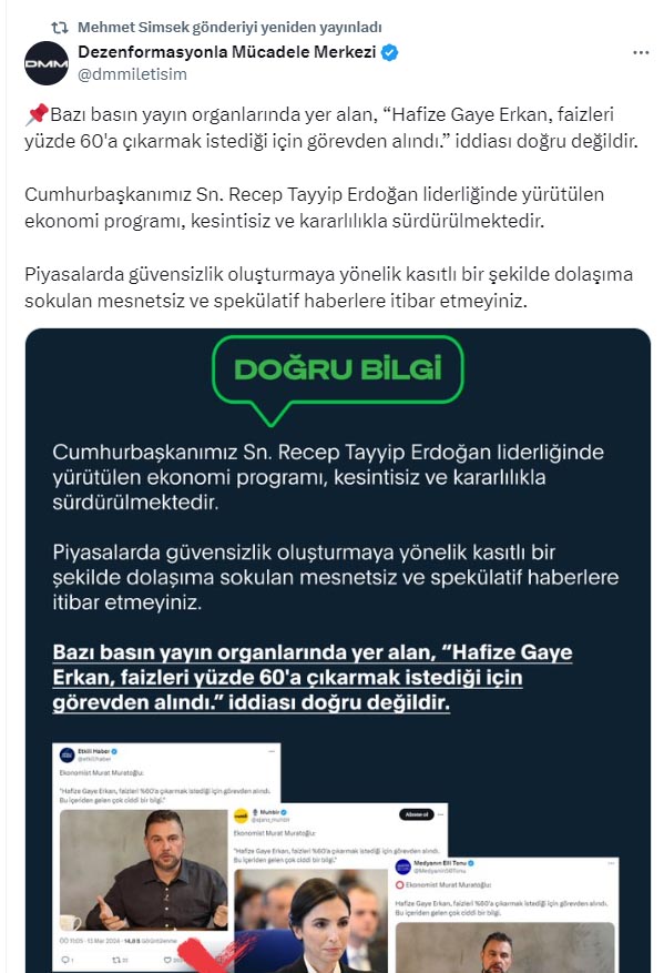 İLETİŞİM Başkanlığı, Dezenformasyonla Mücadele Merkezi (DMM) tarafından, Hafize Gaye Erkan, faizleri yüzde 60a çıkarmak istediği için görevden alındı iddiasının doğru olmadığı belirtildi.DMMden yapılan açıklamada, “Bazı basın yayın organlarında yer alan, Hafize Gaye Erkan, faizleri yüzde 60a çıkarmak istediği için görevden alındı iddiası doğru değildir. Cumhurbaşkanımız Sayın Recep Tayyip Erdoğan liderliğinde yürütülen ekonomi programı, kesintisiz ve kararlılıkla sürdürülmektedir. Piyasalarda güvensizlik oluşturmaya yönelik kasıtlı bir şekilde dolaşıma sokulan mesnetsiz ve spekülatif haberlere itibar etmeyiniz” denildi.Hazine ve Maliye Bakanı Mehmet Şimşek de DMMnin açıklamasını kendi sosyal medya hesabından paylaştı.