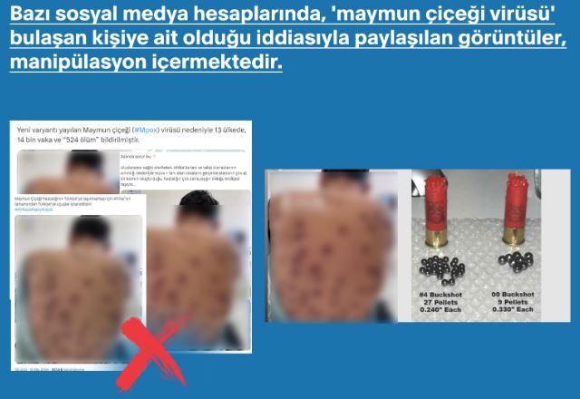 DMMnin sosyal medya hesabından yapılan açıklamada, “Bazı sosyal medya hesaplarında, maymun çiçeği virüsü bulaşan kişiye ait olduğu iddiasıyla paylaşılan görüntüler, manipülasyon içermektedir. Bahse konu fotoğraf, 2022 yılında İrandaki protestolar sırasında av tüfeğinden çıkan saçmalarla vurulan bir adamı göstermektedir. Fotoğrafın maymun çiçeği hastalığı ile hiçbir ilgisi bulunmamaktadır. Asılsız iddialara itibar etmeyiniz” denildi.