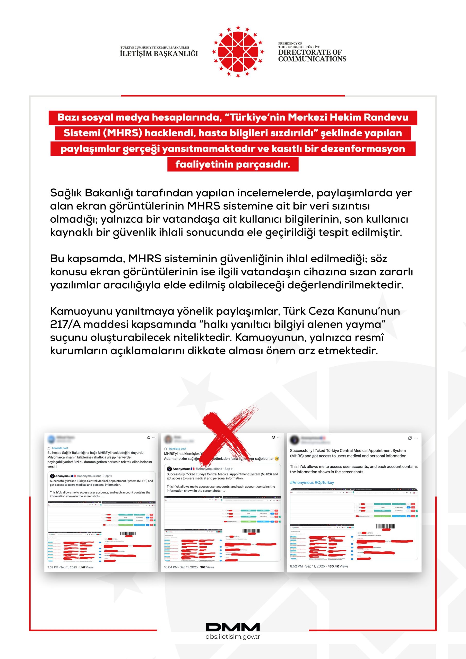 DMMnin sosyal medya hesabından yapılan açıklamada, “Bazı sosyal medya hesaplarında, Türkiye’nin Merkezi Hekim Randevu Sistemi hacklendi, hasta bilgileri sızdırıldı şeklinde yapılan paylaşımlar gerçeği yansıtmamaktadır ve kasıtlı bir dezenformasyon faaliyetinin parçasıdır. Sağlık Bakanlığı tarafından yapılan incelemelerde, paylaşımlarda yer alan ekran görüntülerinin MHRS sistemine ait bir veri sızıntısı olmadığı, yalnızca bir vatandaşa ait kullanıcı bilgilerinin, son kullanıcı kaynaklı bir güvenlik ihlali sonucunda ele geçirildiği tespit edilmiştir. Bu kapsamda, MHRS sisteminin güvenliğinin ihlal edilmediği, söz konusu ekran görüntülerinin ise ilgili vatandaşın cihazına sızan zararlı yazılımlar aracılığıyla elde edilmiş olabileceği değerlendirilmektedir. Kamuoyunu yanıltmaya yönelik paylaşımlar, Türk Ceza Kanununun 217/A maddesi kapsamında halkı yanıltıcı bilgiyi alenen yayma suçunu oluşturabilecek niteliktedir. Kamuoyunun, yalnızca resmî kurumların açıklamalarını dikkate alması önem arz etmektedir” denildi.