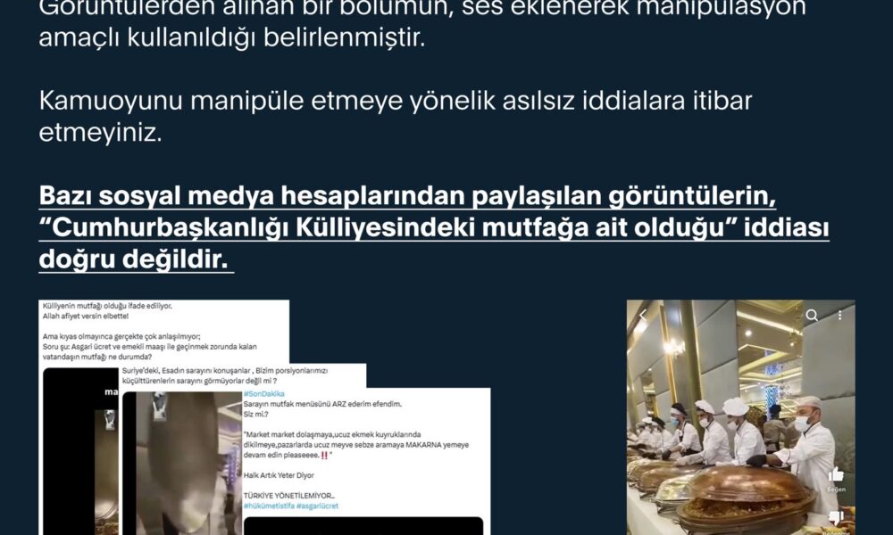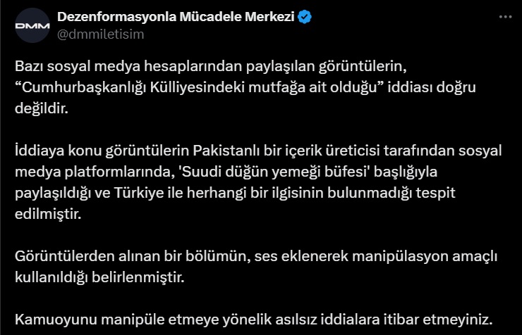 Dezenformasyonla Mücadele Merkezinin sosyal medya hesabından yapılan açıklamada, “Bazı sosyal medya hesaplarından paylaşılan görüntülerin, Cumhurbaşkanlığı Külliyesindeki mutfağa ait olduğu iddiası doğru değildir. İddiaya konu görüntülerin Pakistanlı bir içerik üreticisi tarafından sosyal medya platformlarında, Suudi düğün yemeği büfesi başlığıyla paylaşıldığı ve Türkiye ile herhangi bir ilgisinin bulunmadığı tespit edilmiştir. Görüntülerden alınan bir bölümün, ses eklenerek manipülasyon amaçlı kullanıldığı belirlenmiştir. Kamuoyunu manipüle etmeye yönelik asılsız iddialara itibar etmeyiniz” denildi.