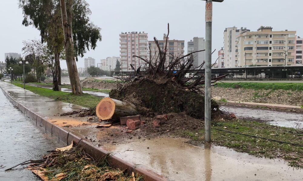 Son 1 haftadır etkili olan sağanak ve fırtına, Akdeniz Bölgesi’nin doğusundaki Adana, Mersin ve Hatayda yaşamı olumsuz etkiledi. MGMnin uyarı verdiği kentlerde sabah saatlerinde fırtına nedeniyle çok sayıda ağaç devrildi. Üzerine ağaç parçaları düşen bazı araçlar zarar gördü. Pek çok cadde ve sokak ile ev ve iş yerini su bastı. Yayalar ve trafikteki sürücüler zor anlar yaşadı.