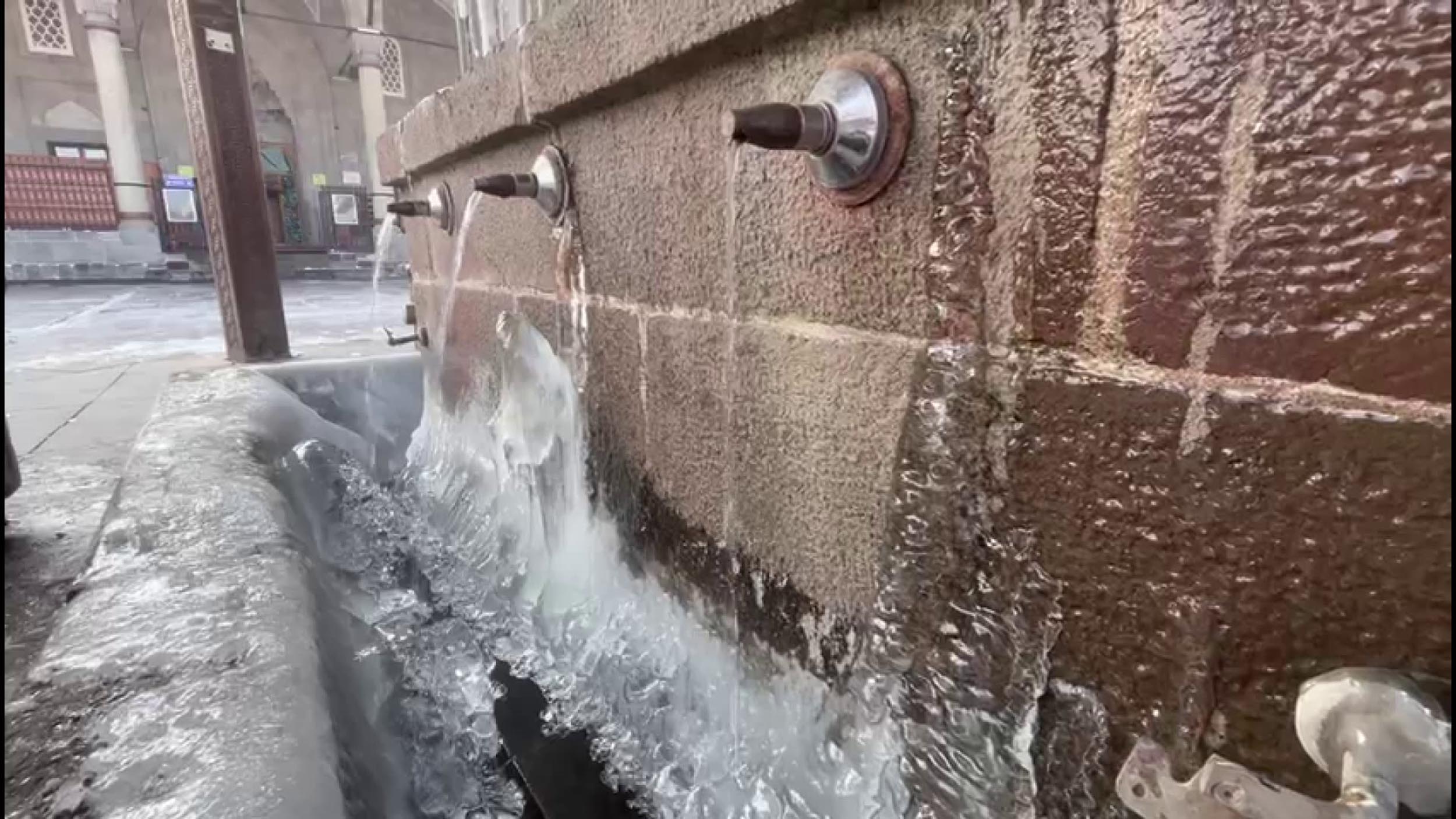 • Hava sıcaklığının sıfırın altında 21.5 derece olarak ölçüldüğü Yakutiye'de ağaçlar kırağı bağladı, şadırvanlar dondu, otobüs duraklarının camları buz tuttu. Fotoğraf: Erzurum,(DHA)