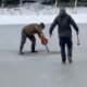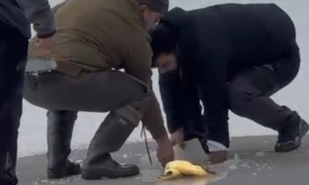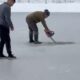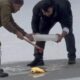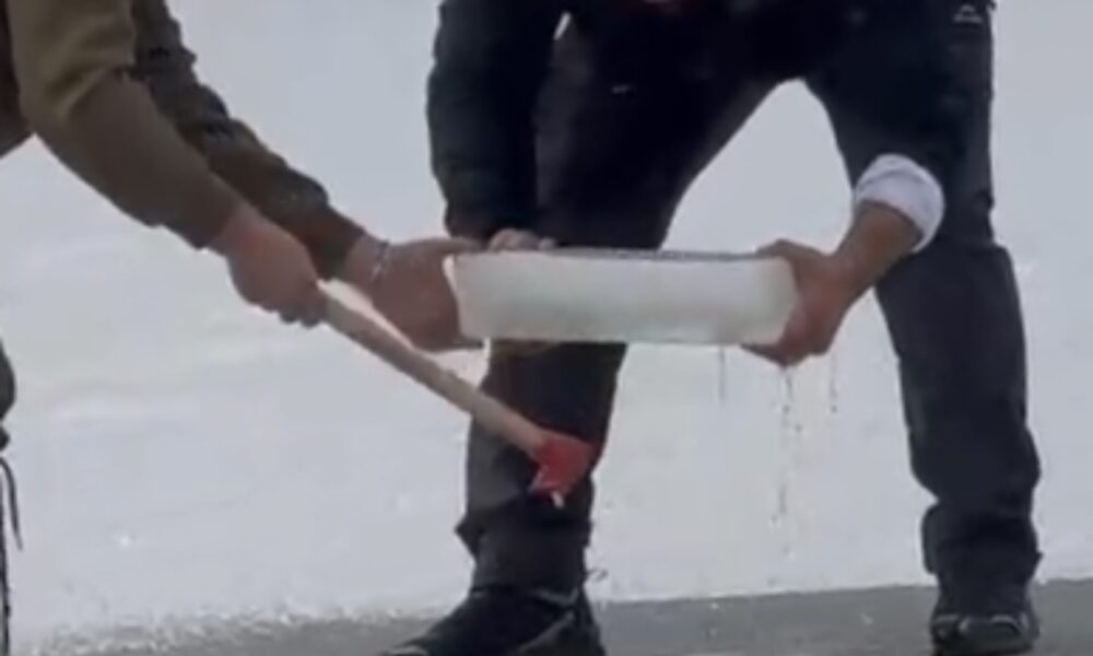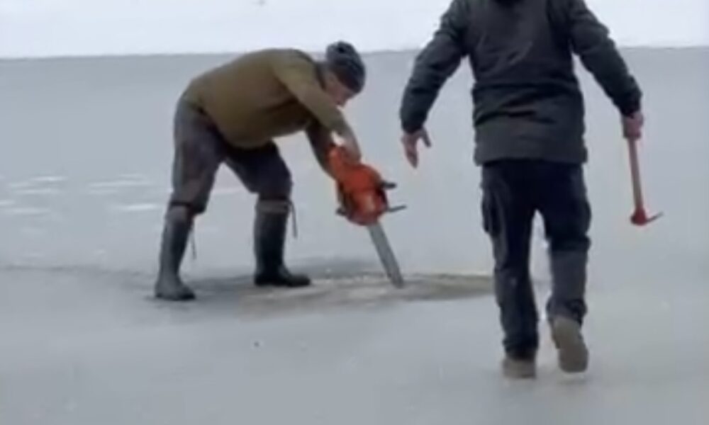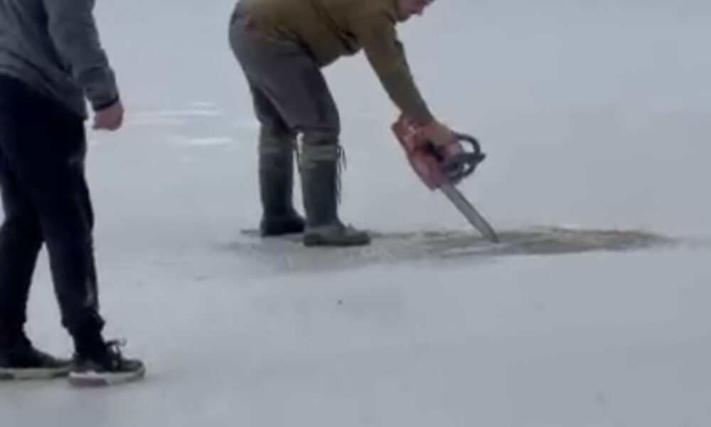 Donan göletin yüzeyindeki buzu motorlu testere ile kesti