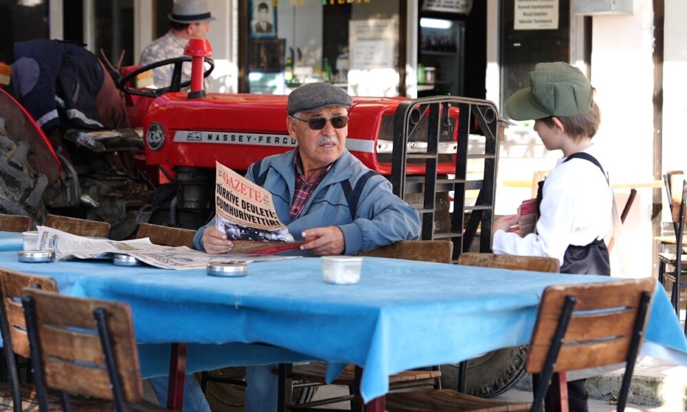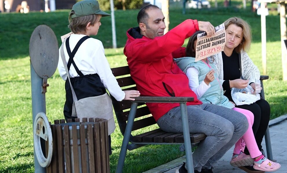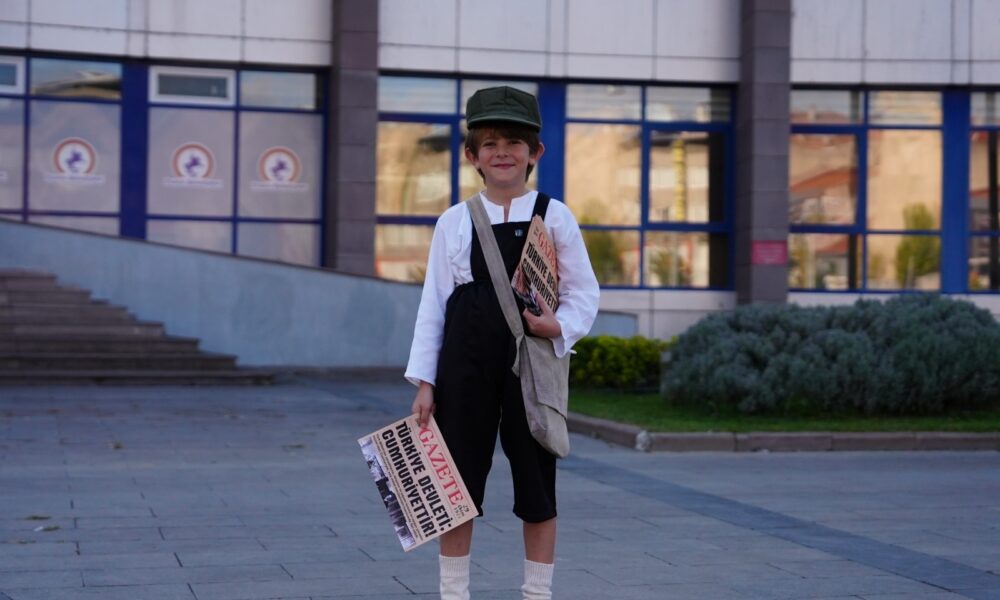 Dönemin kıyafetlerini giyen çocuk, ‘Cumhuriyet’in ilanını yazıyor’ diyerek gazete dağıttı