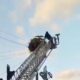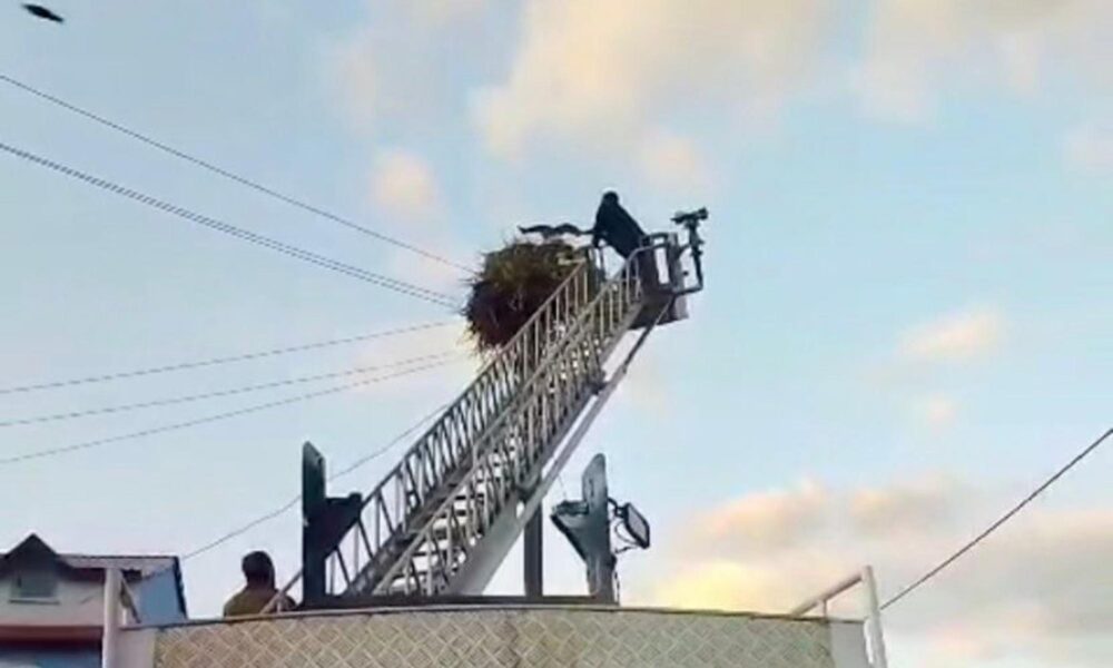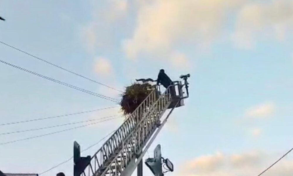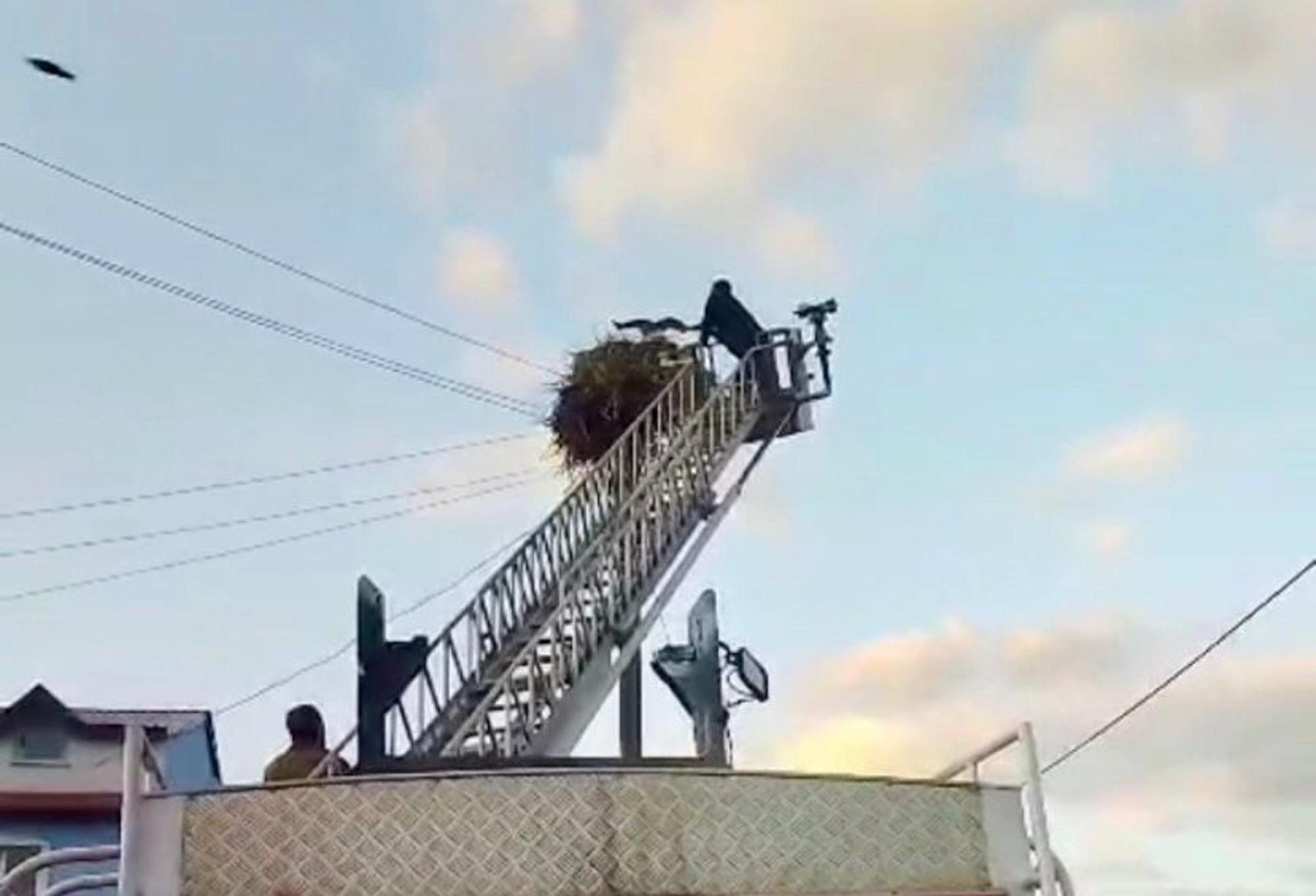 Düşen yavru leylek itfaiye ekipleri tarafından yuvasına konuldu