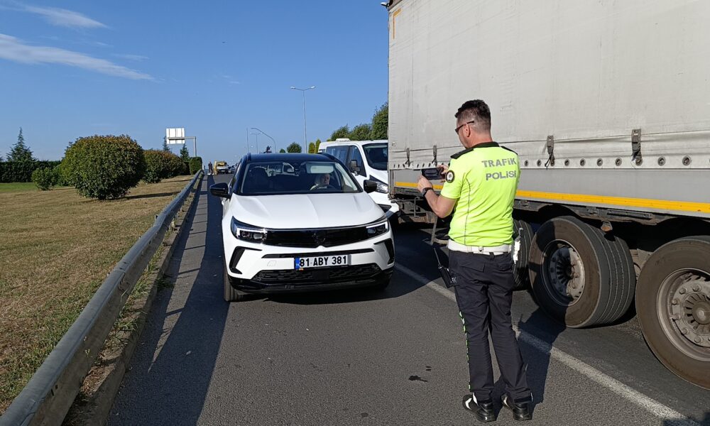 Düzce İl Emniyet Müdürlüğü Trafik Tescil Denetleme Şube Müdürlüğü ekipleri, Kalıcı Konutlar bağlantı yolu Kervan mevki ile Fiskomar Kavşağında denetim yaptı. Dronun kullanıldığı denetimlerde, diğer araçların önüne geçerek trafiği olumsuz etkileyen 20 araç sürücüsüne, emniyet şeridi ihlali ve saygısızca araç kullanmaktan toplam 134 bin 540 TL para cezası uygulandı. Emniyet şeridi ihlali yaparak, cezai işlem uygulanan bir sürücü, polis ekiplerinin yanına gelerek, “Cezamın silinmesini istemiyorum. Allah şahidim ki buradaki insanları da enayi yerine koymak niyetinde değildim. Ama bilgim yoktu” dedi.