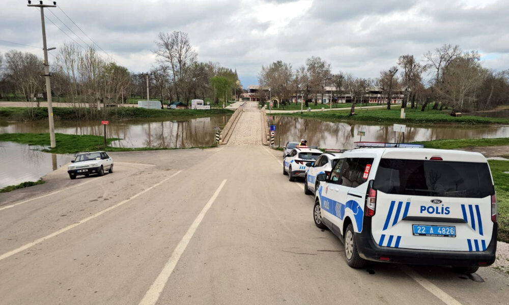 • Tunca Nehri'nin taşmasıyla bir kısmı su altında kalan Sarayiçi'ne girişler, polis ekipleri tarafından durduruldu. Fotoğraf: Edirne, (DHA)