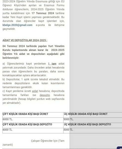 Ege Üniversitesi Öğrenci Köyünde, 2024-2025 öğretim yılı için yurt ücretlerine zam yapıldı. Daha önce 1480 TL olan çift kişilik oda ücreti, yeni dönemde kişi başı 6 bin TL’ye yükseltildi. Üç kişilik odalar için ise kişi başı 1250 TL olan ücret, 5 bin TL’ye çıktı. Ege Üniversitesi Öğrenci Köyü’nün resmi web sitesinde yapılan duyuruya göre, çift kişilik oda için depozito kişi başı 6 bin TL, üç kişilik oda için ise kişi başı 5 bin TL oldu.