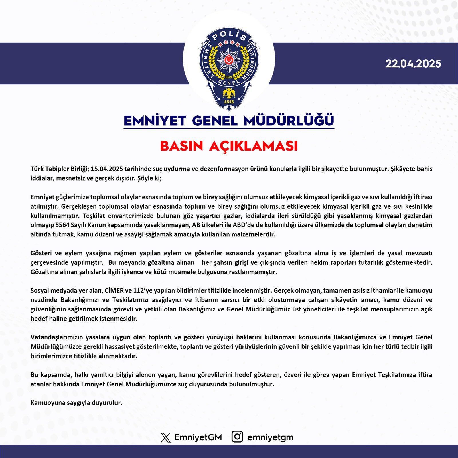 EGM’nin sosyal medya hesabından yapılan yazılı açıklamada, “Türk Tabipler Birliği; 15 Nisan 2025 tarihinde suç uydurma ve dezenformasyon ürünü konularla ilgili bir şikayette bulunmuştur. Şikayete bahis iddialar, mesnetsiz ve gerçek dışıdır. Şöyle ki; Emniyet güçlerimize toplumsal olaylar esnasında toplum ve birey sağlığını olumsuz etkileyecek kimyasal içerikli gaz ve sıvı kullanıldığı iftirası atılmıştır. Gerçekleşen toplumsal olaylar esnasında toplum ve birey sağlığını olumsuz etkileyecek kimyasal içerikli gaz ve sıvı kesinlikle kullanılmamıştır. Teşkilat envanterimizde bulunan göz yaşartıcı gazlar, iddialarda ileri sürüldüğü gibi yasaklanmış kimyasal gazlardan olmayıp 5564 Sayılı Kanun kapsamında yasaklanmayan, AB ülkeleri ile ABDde de kullanıldığı üzere ülkemizde de toplumsal olayları denetim altında tutmak, kamu düzeni ve asayişi sağlamak amacıyla kullanılan malzemelerdir. Gösteri ve eylem yasağına rağmen yapılan eylem ve gösteriler esnasında yaşanan gözaltına alma iş ve işlemleri de yasal mevzuatı çerçevesinde yapılmıştır. Bu meyanda gözaltına alınan her şahsın girişi ve çıkışında verilen hekim raporları tutarlılık göstermektedir. Gözaltına alınan şahıslarla ilgili işkence ve kötü muamele bulgusuna rastlanmamıştır” denildi.