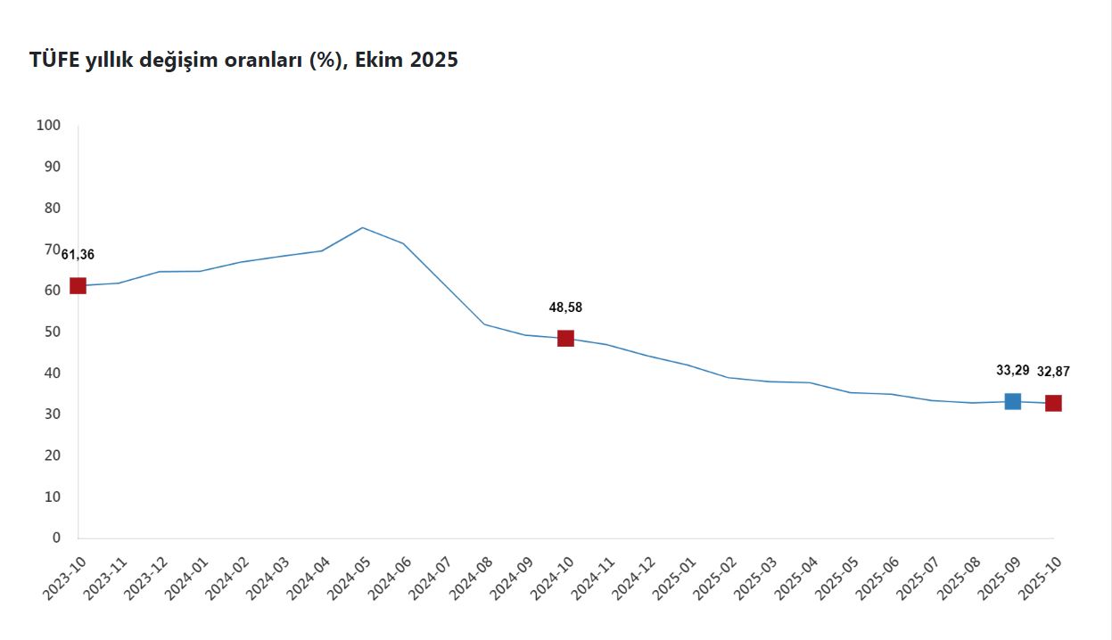 Yurt içi üretici fiyatları, 2025 yılı Ekim ayında bir önceki aya göre yüzde 1,63, bir önceki yılın aralık ayına göre yüzde 25,67, bir önceki yılın aynı ayına göre yüzde 27 ve 12 aylık ortalamalara göre yüzde 25,49 arttı.