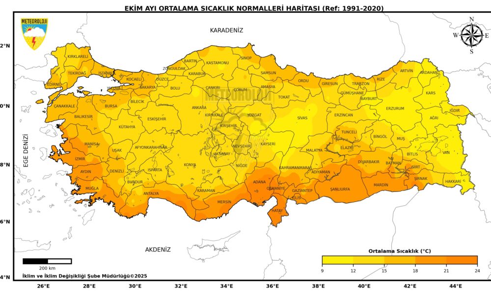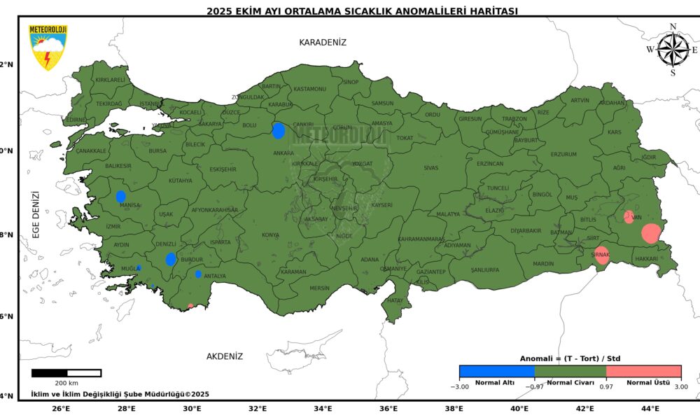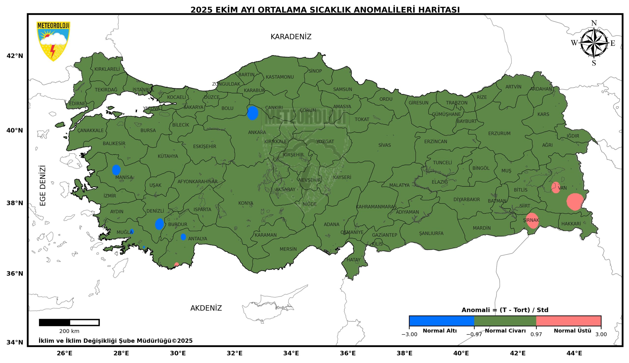 Meteoroloji Genel Müdürlüğü, 2025 yılı Ekim ayı sıcaklık analizi raporunu yayımladı. Buna göre, 2025 yılı Ekim ayında ortalama sıcaklıklar, Dalaman, Acıpayam, Korkuteli, Akhisar, Muğla, Kızılcahamam çevrelerinde mevsim normallerinin altında; Kale (Demre), Van, Başkale ve Şırnak çevrelerinde mevsim normallerinin üzerinde; bölgenin diğer kesimlerinde mevsim normalleri civarında gerçekleşti. 1991-2020 normalleri ekim ayı ortalama sıcaklığı 15.6 derece olup 2025 yılı Ekim ayı sıcaklığı ise 15.7 derece ile normallerinin 0.1 derece üzerinde gerçekleşti. 2025 yılı Ekim ayında en düşük sıcaklık sıfırın altında 6.8 derece ile Sivas Kangal’da, en yüksek sıcaklık ise 37.5 derece ile Şırnak Cizre’de ölçüldü. Öte yandan, 2025 Ekim ayında yeni ekstrem sıcaklık (maksimum, minimum) gerçekleşmediği belirtildi.