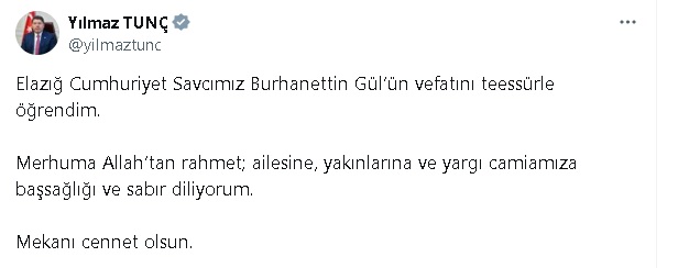 ELAZIĞ Cumhuriyet Savcısı Burhanettin Gül, vefat etti. Adalet Bakanı Yılmaz Tunç, Gül için başsağlığı mesajı yayınladı.Adalet Bakanı Yılmaz Tunç, Cumhuriyet Savcısı Burhanettin Gül için başsağlığı mesajını sosyal medya hesabından yayınladı. Tunç, “Elazığ Cumhuriyet Savcımız Burhanettin Gül’ün vefatını teessürle öğrendim. Merhuma Allahtan rahmet; ailesine, yakınlarına ve yargı camiamıza başsağlığı ve sabır diliyorum. Mekanı cennet olsun” dedi.
