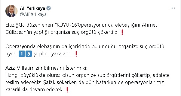 Bakan Yelikayanın sosyal medya hesabından yaptığı açıklamaya göre; Elazığ Cumhuriyet Başsavcılığı ve Emniyet Genel Müdürlüğü KOM Başkanlığı koordinesinde, Elazığ Emniyet Müdürlüğü ekipleri tarafından belirlenen suç örgütüne yönelik operasyon yapıldı. Kuyu-16 operasyonunda elebaşılığını Ahmet Gülbasan’ın yaptığı suç örgütü çökertildi. Operasyonda elebaşının da içerisinde bulunduğu 15 şüpheli, gözaltına alındı. Şüphelilerin; Suç işlemek amacıyla örgüt kurmak, Yağma, Tehdit, Kasten öldürmeye teşebbüs, Mala zarar verme, Genel güvenliğin tehlikeye sokulması, Suça azmettirme, Suçu üstlenme, Hükümlü ve tutuklunun kaçması, 6136 sayılı Kanuna Muhalefet ve Uyuşturucu madde ticareti suçlarını işledikleri tespit edildi. Operasyonlar sonucu; 10 adet ruhsatsız tabanca, 1 adet tüfek ve çok sayıda fişek ele geçirildi. Operasyona katılan personeli tebrik eden Yerlikaya, “Aziz milletimizin bilmesini isterim ki hangi büyüklükte olursa olsun organize suç örgütlerini çökertip, adalete teslim edeceğiz. Şafak sökerken de gün batarken de operasyonlarımız kararlılıkla devam edecek” dedi.