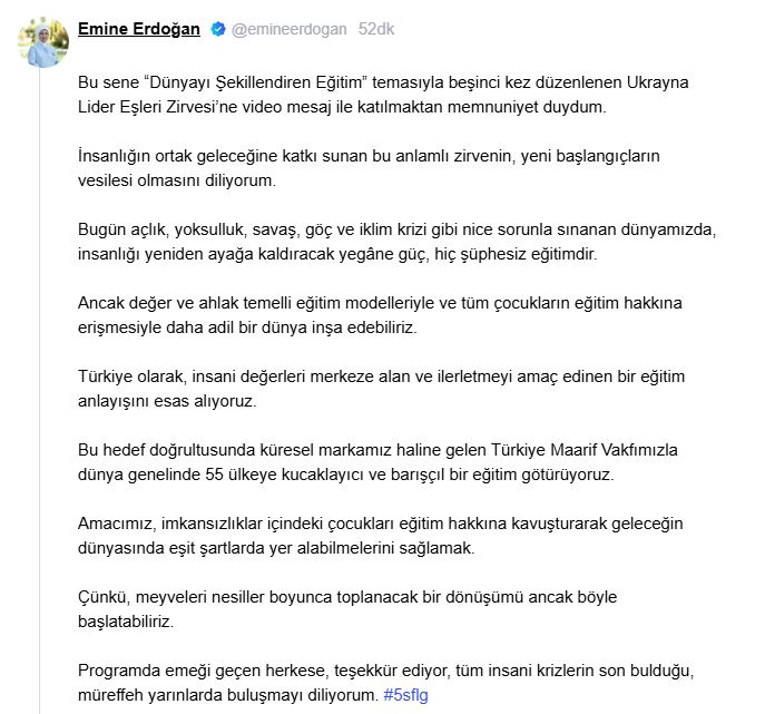 Bunu başarmanın, ancak değer ve ahlak temelli eğitim modelleri ve tüm çocukların eğitim hakkına erişmesiyle mümkün olduğunu vurgulayan Erdoğan, “Şu bir gerçek ki Ukraynanın, Gazzenin, Suriyenin, Afrikanın ve dünyanın tüm çocuklarına umutla bakabildikleri aydınlık bir gelecek borçluyuz. Türkiye olarak, küresel markamız haline gelen Türkiye Maarif Vakfımızla dünya genelinde 55 ülkeye adil, kucaklayıcı ve barışçıl bir eğitim götürüyoruz. Çünkü, meyveleri nesiller boyunca toplanacak bir dönüşümü ancak böyle başlatabiliriz. Bu düşüncelerle, 5inci Lider Eşleri Zirvesinin, yeni başlangıçların vesilesi olmasını temenni ediyorum” ifadelerini kullandı.