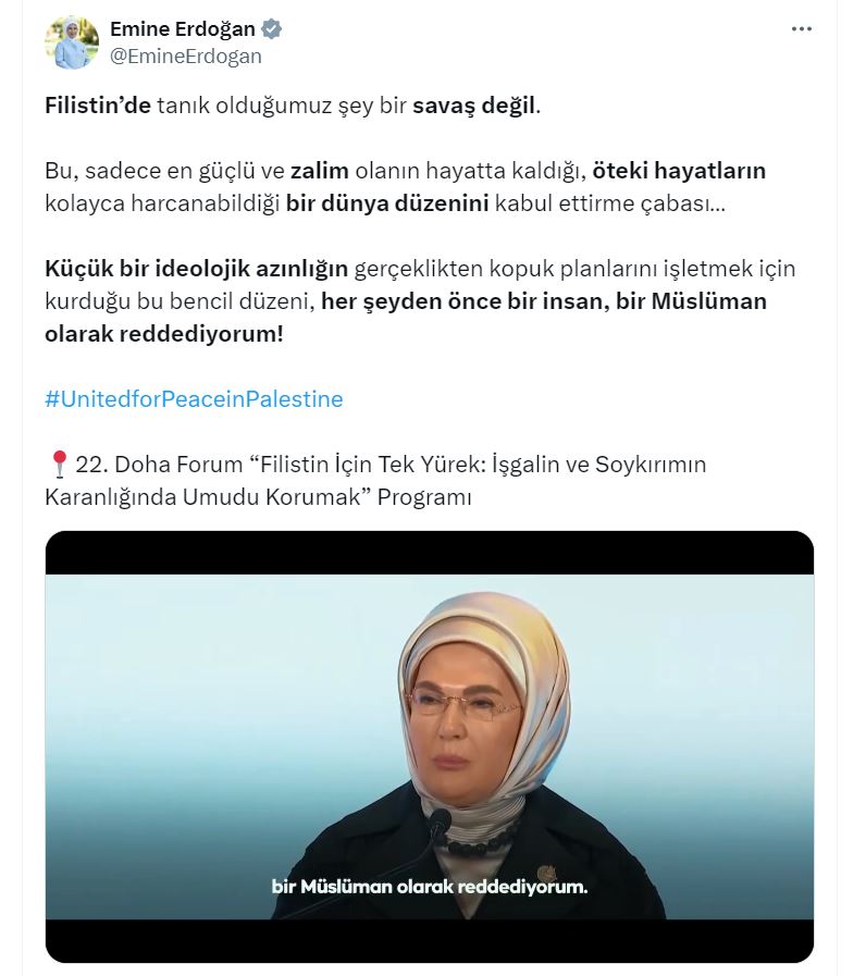 Emine Erdoğan, 22nci Doha Forumu kapsamında düzenlenen Filistin İçin Tek Yürek: İşgalin ve Soykırımın Karanlığında Umudu Korumak programına ilişkin sosyal medya hesabından paylaşımda bulundu. Erdoğan, paylaşımında, “Filistinde tanık olduğumuz şey bir savaş değil. Bu, sadece en güçlü ve zalim olanın hayatta kaldığı, öteki hayatların kolayca harcanabildiği bir dünya düzenini kabul ettirme çabası. Küçük bir ideolojik azınlığın gerçeklikten kopuk planlarını işletmek için kurduğu bu bencil düzeni, her şeyden önce bir insan, bir Müslüman olarak reddediyorum” ifadelerini kullandı.