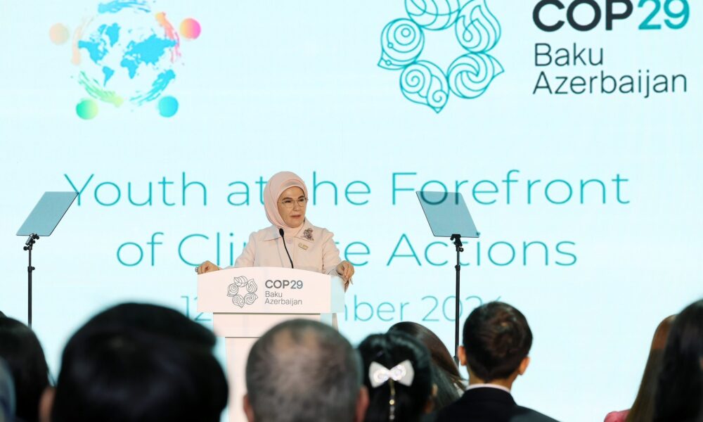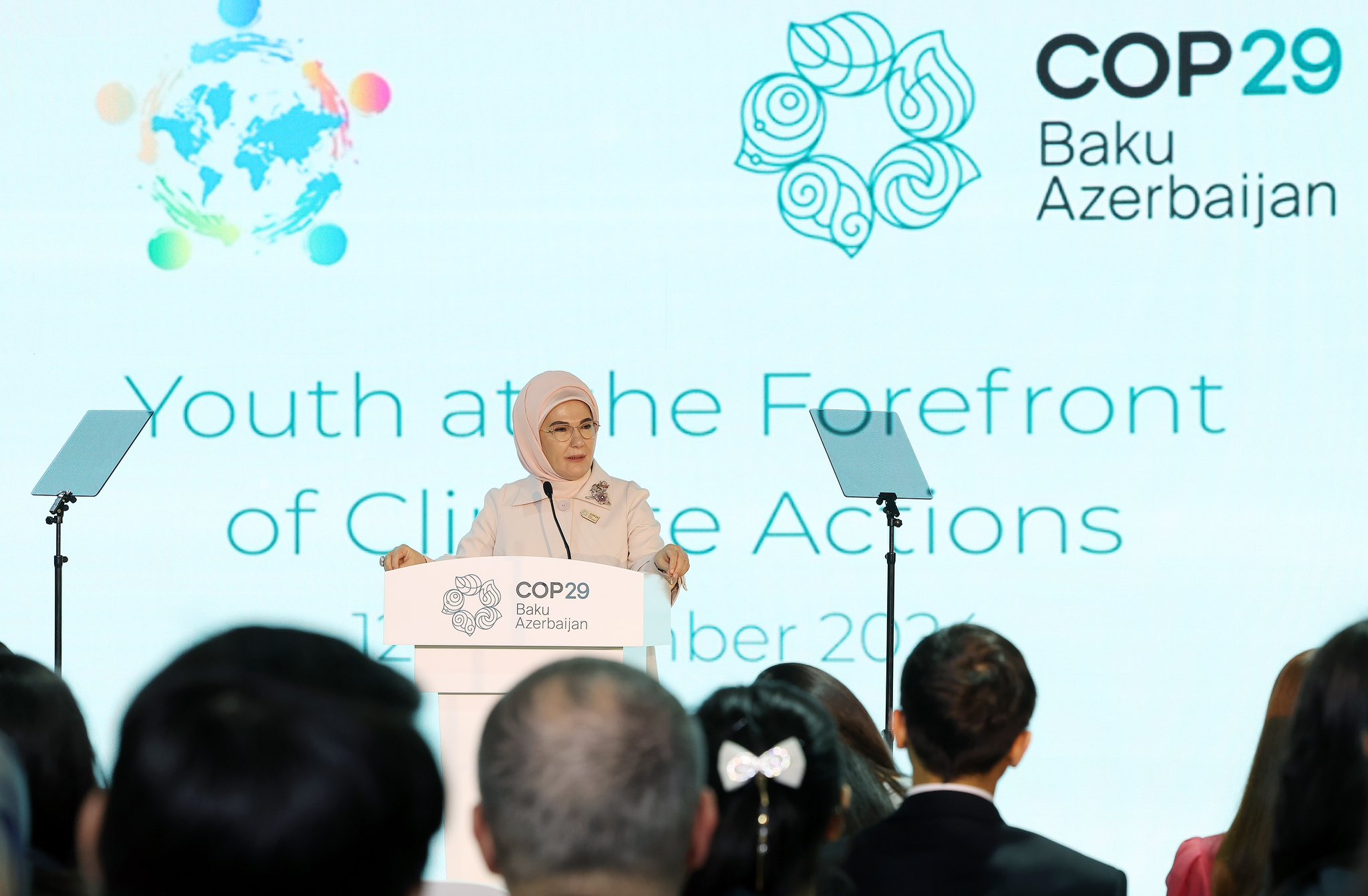 Cumhurbaşkanı Erdoğanın, Birleşmiş Milletler (BM) İklim Değişikliği Çerçeve Sözleşmesi 29uncu Taraflar Konferansı (COP29) kapsamında düzenlenen Dünya Liderleri İklim Zirvesine katılmak için gerçekleştirdiği resmi ziyarete eşlik eden Emine Erdoğan, Ekolojik Eğitim başlıklı etkinlikte iklim gönüllüsü gençlerle buluştu. Emine Erdoğan, himayesindeki Sıfır Atık Projesi çerçevesinde kurulan Sıfır Atık Vakfı, Azerbaycan Cumhurbaşkanı İlham Aliyevin eşi Mihriban Aliyevanın başkanlığını yürüttüğü Haydar Aliyev Vakfı ve Özbekistan Zamin Uluslararası Halk Vakfı işbirliğinde düzenlenen etkinlikteki konuşmasında, kardeş Azerbaycanda gençlerle buluşmaktan duyduğu mutluluğu dile getirdi. COP29un hayırlara vesile olmasını dileyen Emine Erdoğan, Azerbaycanı örnek ev sahipliğinden dolayı kutladı.