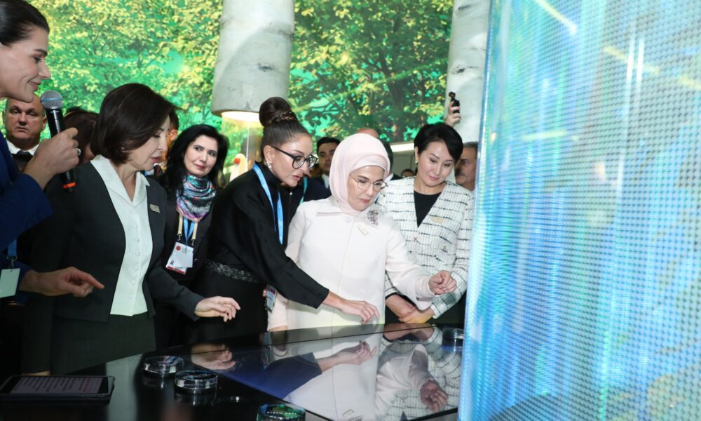 Buradaki stantları gezen Emine Erdoğan, farkındalık oluşturmak üzere geliştirilen ‘Düşünce Taşı’ adlı bölümde plastik kirliliğiyle mücadele için taş attı. Ardından Emine Erdoğan, Bakan Yumaklı ile Azerbaycanın Shamaki Bölgesine canlı bağlanarak, ağaç dikme kampanyasını başlattı.