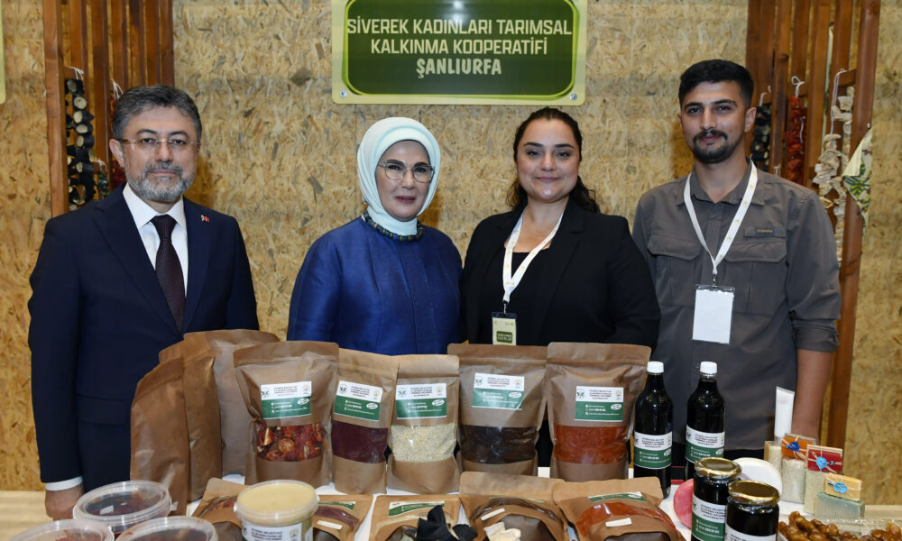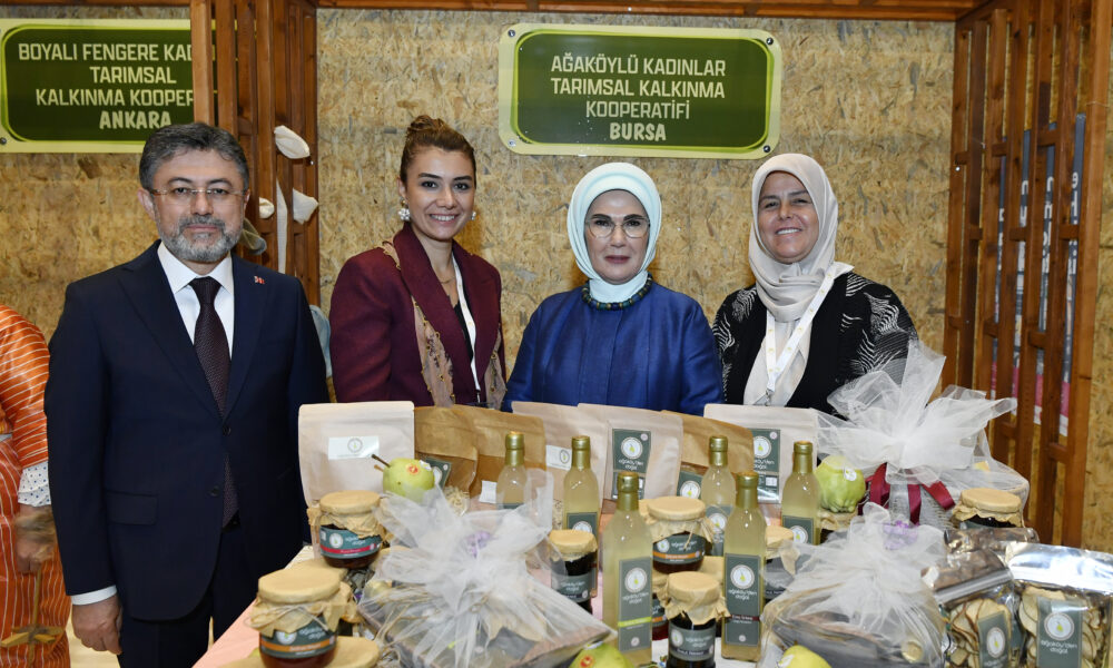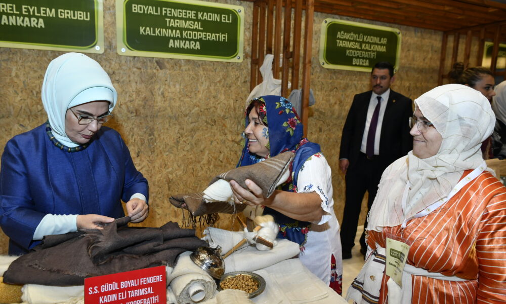 Emine Erdoğan, Bakan Yumaklı ile 15 Ekim Dünya Kadın Çiftçiler Günü dolayısıyla Türkiyenin çeşitli bölgelerinden 18 kadın kooperatifince fuaye alanında açılan stantları gezdi. Fuaye alanında kadın çiftçilerin, pamuk dallarından yapılan çiçek buketiyle karşılanan Emine Erdoğan, daha sonra stantlarda kadın çiftçilerin AB Tescilli Coğrafi İşaretli ürünler ile Ankara Sofu kumaşından ürünler başta olmak üzere tarhana, erişte, marmelat, reçel, sabun, kolonya, gül yağı, dokuma ve çeşitli el sanatları ürünlerini tek tek inceledi. Kadın çiftçilerden kooperatifleri ve ürettikleri ürünlere ilişkin bilgi alan Emine Erdoğan, başarılarından dolayı tebrik edip, fotoğraf çektirdi.