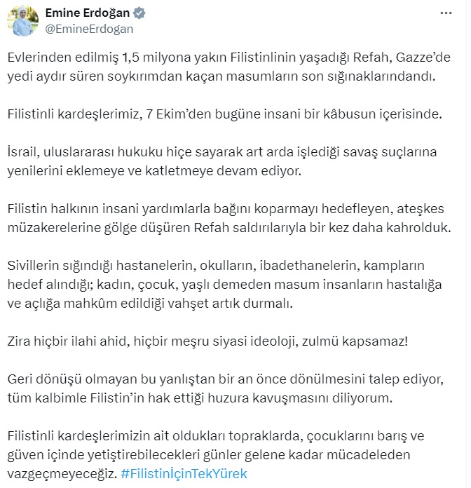 İsrailin uluslararası hukuku hiçe sayarak art arda işlediği savaş suçlarına yenilerini eklemeye ve katletmeye devam ettiğini kaydeden, Emine Erdoğan, “Filistin halkının insani yardımlarla bağını koparmayı hedefleyen, ateşkes müzakerelerine gölge düşüren Refah saldırılarıyla bir kez daha kahrolduk. Sivillerin sığındığı hastanelerin, okulların, ibadethanelerin, kampların hedef alındığı, kadın, çocuk, yaşlı demeden masum insanların hastalığa ve açlığa mahkum edildiği vahşet artık durmalı. Zira hiçbir ilahi ahit, hiçbir meşru siyasi ideoloji, zulmü kapsamaz. Geri dönüşü olmayan bu yanlıştan bir an önce dönülmesini talep ediyor, tüm kalbimle Filistinin hak ettiği huzura kavuşmasını diliyorum. Filistinli kardeşlerimizin ait oldukları topraklarda, çocuklarını barış ve güven içinde yetiştirebilecekleri günler gelene kadar mücadeleden vazgeçmeyeceğiz” ifadelerini kullandı.