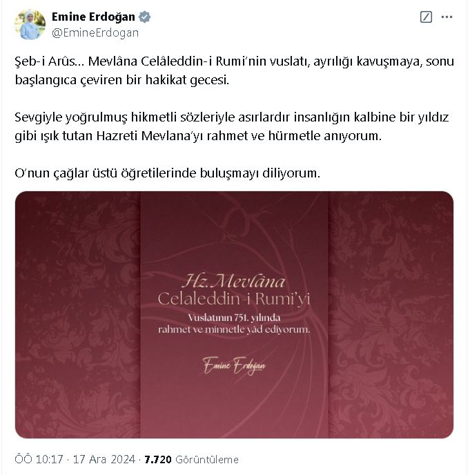 Emine Erdoğan, Mevlana Celaleddin-i Ruminin 751inci ölüm yıl dönümü dolayısıyla sosyal medya hesabından yaptığı paylaşımda, “Şeb-i Arus. Mevlana Celaleddin-i Ruminin vuslatı, ayrılığı kavuşmaya, sonu başlangıca çeviren bir hakikat gecesi. Sevgiyle yoğrulmuş hikmetli sözleriyle asırlardır insanlığın kalbine bir yıldız gibi ışık tutan Hazreti Mevlanayı rahmet ve hürmetle anıyorum. Onun çağlar üstü öğretilerinde buluşmayı diliyorum” ifadelerini kullandı.