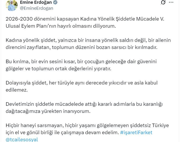 Emine Erdoğan, bugün Resmi Gazetede yayımlanan ve detayları Cumhurbaşkanı Recep Tayyip Erdoğan tarafından açıklanan Kadına Yönelik Şiddetle Mücadele 5inci Ulusal Eylem Planıyla ilgili paylaşımda bulundu. Erdoğan, sosyal medya hesabından yaptığı paylaşımda, “2026-2030 dönemini kapsayan Kadına Yönelik Şiddetle Mücadele 5inci Ulusal Eylem Planının hayırlı olmasını diliyorum. Kadına yönelik şiddet, yalnızca bir insana yönelik saldırı değil, bir ailenin direncini zayıflatan, toplumun düzenini bozan sarsıcı bir kırılmadır. Bu kırılma, bir evin sesini kısar, bir çocuğun geleceğe dair güvenini gölgeler ve toplumun ortak değerlerini yıpratır. Dolayısıyla şiddet, her türüyle aynı derecede yıkıcıdır ve asla kabul edilemez. Devletimizin şiddetle mücadelede attığı kararlı adımlarla bu karanlığı dağıtacağımıza yürekten inanıyorum. Hiçbir haneyi sarsmayan, hiçbir yaşamı gölgelemeyen şiddetsiz Türkiye için el ve gönül birliği ile çalışmaya devam edelim” ifadelerini kullandı.