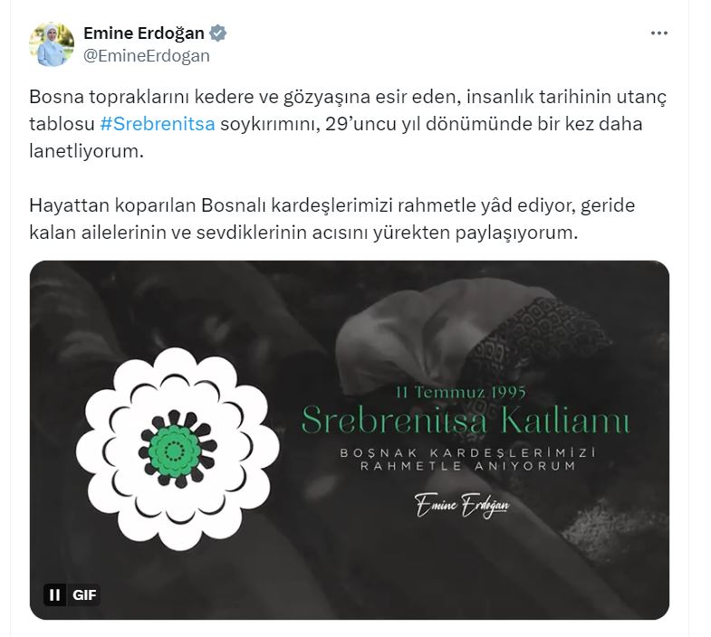 Emine Erdoğan, sosyal medya hesabından yaptığı açıklamada, “Bosna topraklarını kedere ve gözyaşına esir eden, insanlık tarihinin utanç tablosu Srebrenitsa Soykırımını, 29uncu yıl dönümünde bir kez daha lanetliyorum. Hayattan koparılan Bosnalı kardeşlerimizi rahmetle yad ediyor, geride kalan ailelerinin ve sevdiklerinin acısını yürekten paylaşıyorum” dedi.