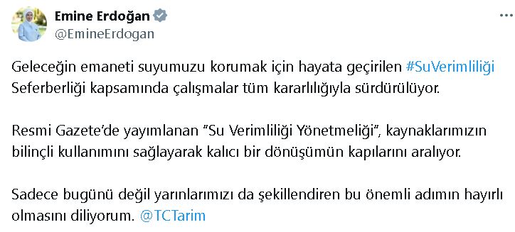 Emine Erdoğan, Resmi Gazetenin dünkü sayısında yayımlanan Su Verimliliği Yönetmeliğine ilişkin sosyal medya hesabından yaptığı açıklamada, “Geleceğin emaneti suyumuzu korumak için hayata geçirilen Su Verimliliği Seferberliği kapsamında çalışmalar tüm kararlılığıyla sürdürülüyor. Resmi Gazetede yayımlanan Su Verimliliği Yönetmeliği, kaynaklarımızın bilinçli kullanımını sağlayarak kalıcı bir dönüşümün kapılarını aralıyor. Sadece bugünü değil, yarınlarımızı da şekillendiren bu önemli adımın hayırlı olmasını diliyorum” dedi.