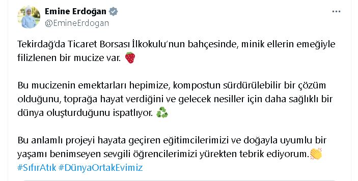 Emine Erdoğan, sosyal medya hesabından, Tekirdağda okullarında yaptıkları kompost gübreyle çilek yetiştiren öğrencilerin videosunu paylaşarak, “Tekirdağda Ticaret Borsası İlkokulu’nun bahçesinde, minik ellerin emeğiyle filizlenen bir mucize var. Bu mucizenin emektarları hepimize, kompostun sürdürülebilir bir çözüm olduğunu, toprağa hayat verdiğini ve gelecek nesiller için daha sağlıklı bir dünya oluşturduğunu ispatlıyor. Bu anlamlı projeyi hayata geçiren eğitimcilerimizi ve doğayla uyumlu bir yaşamı benimseyen sevgili öğrencilerimizi yürekten tebrik ediyorum” ifadelerini kullandı.