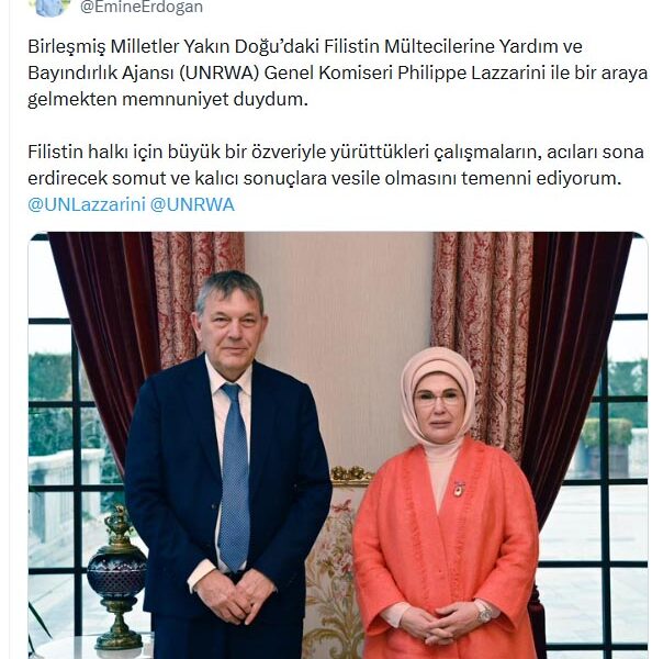 Emine Erdoğan, NSosyal hesabından görüşmeye ilişkin yaptığı paylaşımda, “Birleşmiş Milletler Yakın Doğudaki Filistin Mültecilerine Yardım ve Bayındırlık Ajansı Genel Komiseri Philippe Lazzarini ile bir araya gelmekten memnuniyet duydum. Filistin halkı için büyük bir özveriyle yürüttükleri çalışmaların, acıları sona erdirecek somut ve kalıcı sonuçlara vesile olmasını temenni ediyorum.” ifadelerini kullandı.