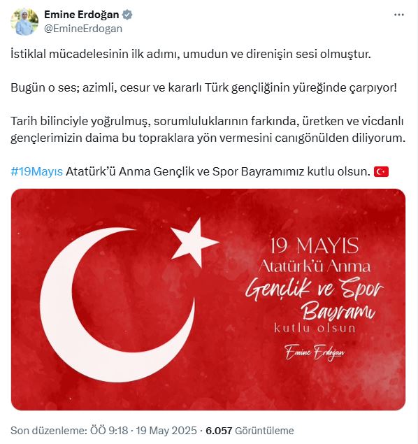 Emine Erdoğan, sosyal medya hesabından paylaştığı mesajda, “İstiklal mücadelesinin ilk adımı, umudun ve direnişin sesi olmuştur. Bugün o ses; azimli, cesur ve kararlı Türk gençliğinin yüreğinde çarpıyor. Tarih bilinciyle yoğrulmuş, sorumluluklarının farkında, üretken ve vicdanlı gençlerimizin daima bu topraklara yön vermesini canı gönülden diliyorum. 19 Mayıs Atatürkü Anma, Gençlik ve Spor Bayramımız kutlu olsun” ifadelerini kullandı.