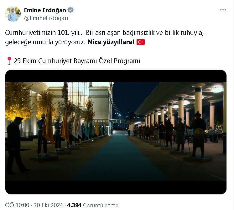Emine Erdoğan, sosyal medya hesabından, programa ilişkin videoyu paylaşarak, “Cumhuriyetimizin 101inci yılı. 1 asrı aşan bağımsızlık ve birlik ruhuyla, geleceğe umutla yürüyoruz. Nice yüzyıllara” ifadelerine yer verdi.