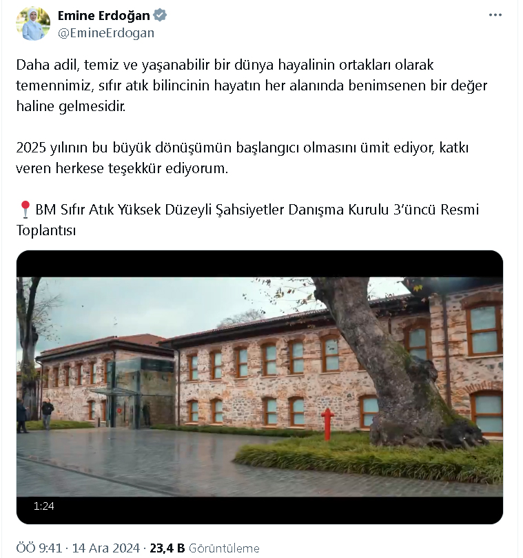 Emine Erdoğan, sosyal medya hesabından yaptığı paylaşımda, “Daha adil, temiz ve yaşanabilir bir dünya hayalinin ortakları olarak temennimiz, Sıfır Atık bilincinin hayatın her alanında benimsenen bir değer haline gelmesidir. 2025 yılının bu büyük dönüşümün başlangıcı olmasını ümit ediyor, katkı veren herkese teşekkür ediyorum” dedi.