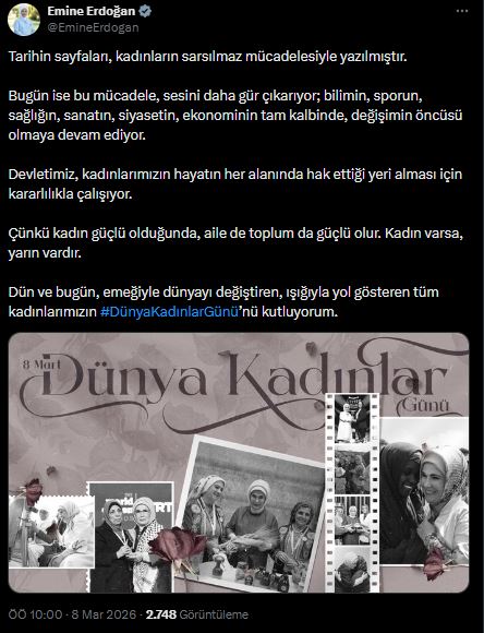 Emine Erdoğan, sanal medya hesabından yayımladığı mesajda, “Tarihin sayfaları, kadınların sarsılmaz mücadelesiyle yazılmıştır. Bugün ise bu mücadele, sesini daha gür çıkarıyor; bilimin, sporun, sağlığın, sanatın, siyasetin, ekonominin tam kalbinde, değişimin öncüsü olmaya devam ediyor. Devletimiz, kadınlarımızın hayatın her alanında hak ettiği yeri alması için kararlılıkla çalışıyor. Çünkü kadın güçlü olduğunda, aile de toplum da güçlü olur. Kadın varsa, yarın vardır. Dün ve bugün, emeğiyle dünyayı değiştiren, ışığıyla yol gösteren tüm kadınlarımızın Dünya Kadınlar Günü’nü kutluyorum” ifadelerini kullandı.