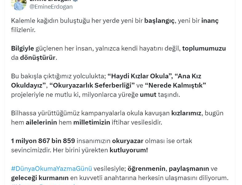 Emine Erdoğan, sosyal medya hesabından yaptığı açıklamada, “Kalemle kağıdın buluştuğu her yerde yeni bir başlangıç, yeni bir inanç filizlenir. Bilgiyle güçlenen her insan, yalnızca kendi hayatını değil, toplumumuzu da dönüştürür. Bu bakışla çıktığımız yolculukta; Haydi Kızlar Okula, Ana Kız Okuldayız, Okuryazarlık Seferberliği ve Nerede Kalmıştık projeleriyle ne mutlu ki milyonlarca yüreğe umut taşındı. Bilhassa yürüttüğümüz kampanyalarla okula kavuşan kızlarımız, bugün hem ailelerinin hem milletimizin iftihar vesilesidir. 1 milyon 867 bin 859 insanımızın okuryazar olması ise ortak sevincimizdir. Her birini yürekten kutluyorum. Dünya Okuma Yazma Günü vesilesiyle; öğrenmenin, paylaşmanın ve geleceği kurmanın en kuvvetli anahtarına herkesin ulaşmasını diliyorum” dedi.