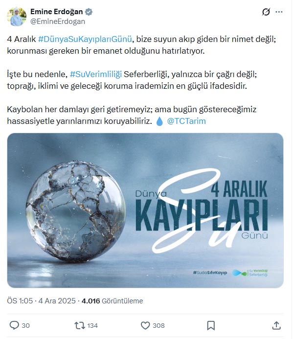 Emine Erdoğan, sosyal medya hesabından yaptığı paylaşımda, “4 Aralık Dünya Su Kayıpları Günü, bize suyun akıp giden bir nimet değil; korunması gereken bir emanet olduğunu hatırlatıyor. İşte bu nedenle, su verimliliği seferberliği, yalnızca bir çağrı değil; toprağı, iklimi ve geleceği koruma irademizin en güçlü ifadesidir. Kaybolan her damlayı geri getiremeyiz; ama bugün göstereceğimiz hassasiyetle yarınlarımızı koruyabiliriz” ifadelerini kullandı.