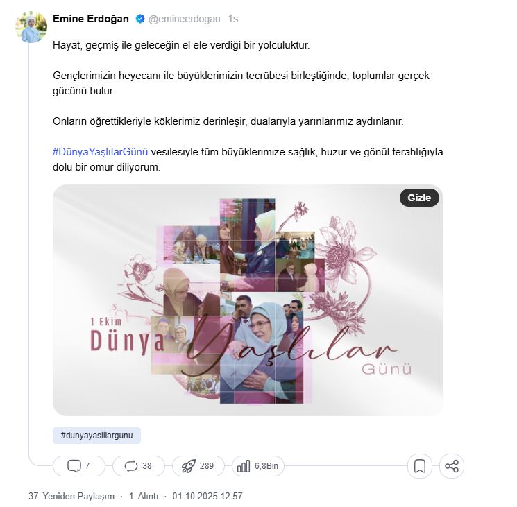 Emine Erdoğan, NSosyal hesabından yaptığı paylaşımda, “Hayat, geçmiş ile geleceğin el ele verdiği bir yolculuktur. Gençlerimizin heyecanı ile büyüklerimizin tecrübesi birleştiğinde toplumlar gerçek gücünü bulur. Onların öğrettikleriyle köklerimiz derinleşir, dualarıyla yarınlarımız aydınlanır. Dünya Yaşlılar Günü vesilesiyle tüm büyüklerimize sağlık, huzur ve gönül ferahlığıyla dolu bir ömür diliyorum” dedi.