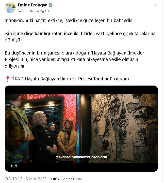 Emine Erdoğan, sosyal medya hesabından yaptığı paylaşımda, “İnanıyorum ki hayat; ektikçe, işledikçe güzelleşen bir bahçedir. İşin içine diğerkamlığı katan incelikli fikirler, vakti gelince çiçek tarlalarına dönüşür. Bu düşüncenin bir nişanesi olarak doğan Hayata Bağlayan İlmekler Projesinin, nice yeniden ayağa kalkma hikayesine vesile olmasını diliyorum” dedi.