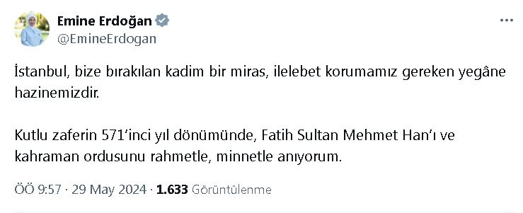 Emine Erdoğan, İstanbulun Fethinin yıl dönümü vesilesiyle sosyal medya hesabından paylaştığı mesajda, “İstanbul, bize bırakılan kadim bir miras, ilelebet korumamız gereken yegane hazinemizdir. Kutlu zaferin 571inci yıl dönümünde, Fatih Sultan Mehmet Hanı ve kahraman ordusunu rahmetle, minnetle anıyorum” dedi.