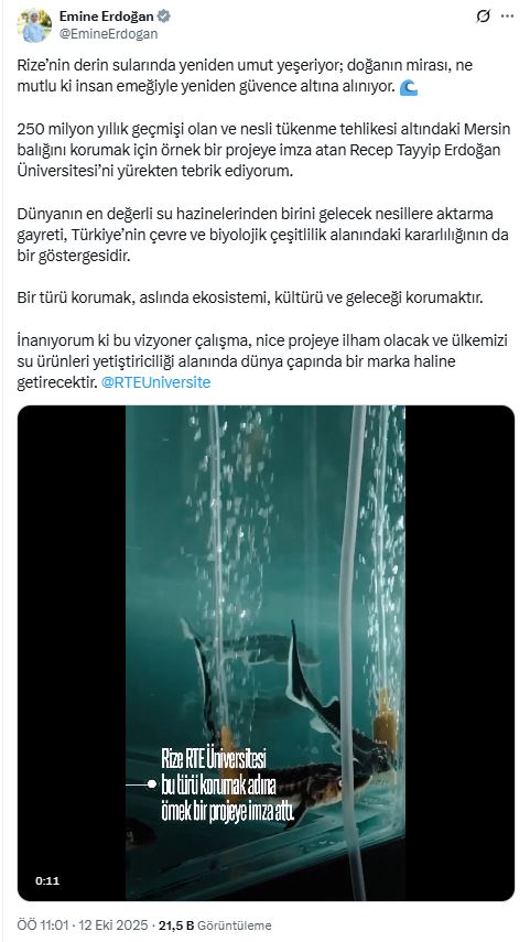 Emine Erdoğan, sosyal medya hesabından yaptığı paylaşımda, “Rizenin derin sularında yeniden umut yeşeriyor, doğanın mirası, ne mutlu ki insan emeğiyle yeniden güvence altına alınıyor. 250 milyon yıllık geçmişi olan ve nesli tükenme tehlikesi altındaki mersin balığını korumak için örnek bir projeye imza atan Recep Tayyip Erdoğan Üniversitesini yürekten tebrik ediyorum. Dünyanın en değerli su hazinelerinden birini gelecek nesillere aktarma gayreti, Türkiyenin çevre ve biyolojik çeşitlilik alanındaki kararlılığının da bir göstergesidir. Bir türü korumak, aslında ekosistemi, kültürü ve geleceği korumaktır. İnanıyorum ki bu vizyoner çalışma, nice projeye ilham olacak ve ülkemizi su ürünleri yetiştiriciliği alanında dünya çapında bir marka haline getirecektir” ifadelerini kullandı.