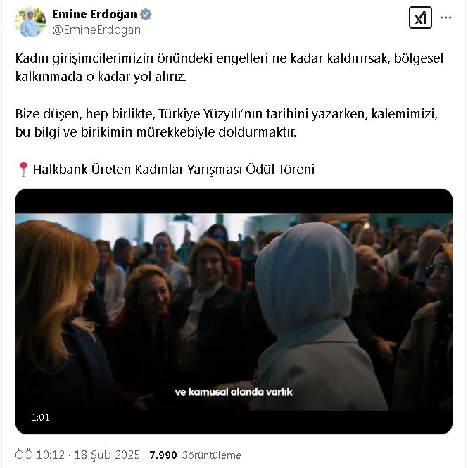 Emine Erdoğan, sosyal medya hesabından yaptığı paylaşımda, “Kadın girişimcilerimizin önündeki engelleri ne kadar kaldırırsak, bölgesel kalkınmada o kadar yol alırız. Bize düşen, hep birlikte, Türkiye Yüzyılının tarihini yazarken; kalemimizi, bu bilgi ve birikimin mürekkebiyle doldurmaktır” dedi. Paylaşımda ödül törenine ilişkin görüntülere de yer verildi.